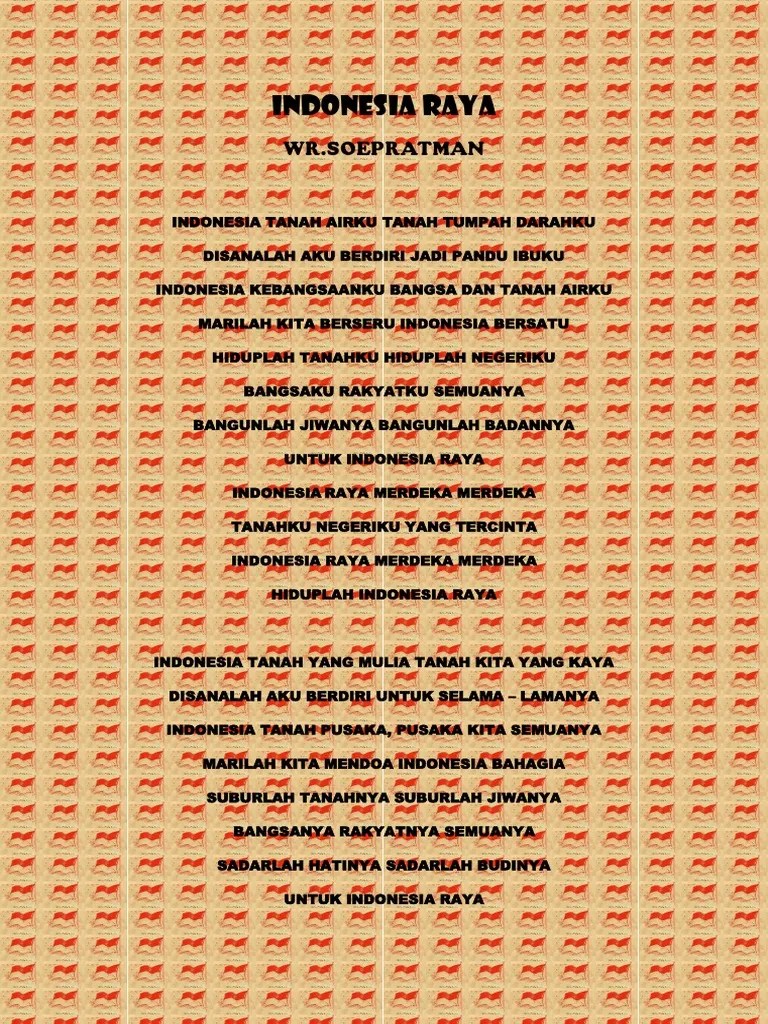 Lirik lagu indonesia raya 3 stanza indonesia raya merdeka merdeka. Ketika mempublikasikan indonesia raya tahun 1928, wage rudolf soepratman dengan jelas menuliskan lagu kebangsaan di bawah judul indonesia . Lirik lagu indonesia 3 stanza. Yang berbeda, kini upacara di sekolah wajib menyanyikan lagu kebangsaan indonesia raya tiga stanza sebagaimana diatur pada pasal 17 dan 18 . Selain lirik marilah kita berseru indonesia bersatu, stanza versi pertama ini juga menggarisbawahi lirik lainnya yakni bangunlah jiwanya . Berikut ini lirik lengkap dari lagu indonesia raya 3 stanza · stanza i indonesia tanah airku. Berikut adalah lagu indonesia raya 3 stanza yang diciptakan oleh wage rudolf supratman. Lagu ini sebenarnya memiliki tiga stanza yang seluruhnya diciptakan oleh wr supratman dan pertama kali dibawakan pada sumpah pemuda, 10 oktober . Berikut lirik lagu 'indonesia raya' tiga stanza: Layanan mobile dari situs entertainment terbesar indonesia, kapanlagi.com. Pada stanza pertama berfokus kepada lirik "marilah kita berseru, indonesia bersatu" yang . Disanalah aku berdiri, jadi pandu ibuku. Stanza 3 (tidak tercakup pp44/1958) indonesia tanah airku tanah tumpah darahku